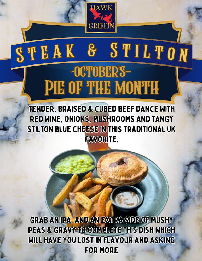 Made with Fool's Gold Farm steak slow cooked in English ale, carrots, mushrooms, celery, & onion in a short crust pastry. Served with your choice of side.